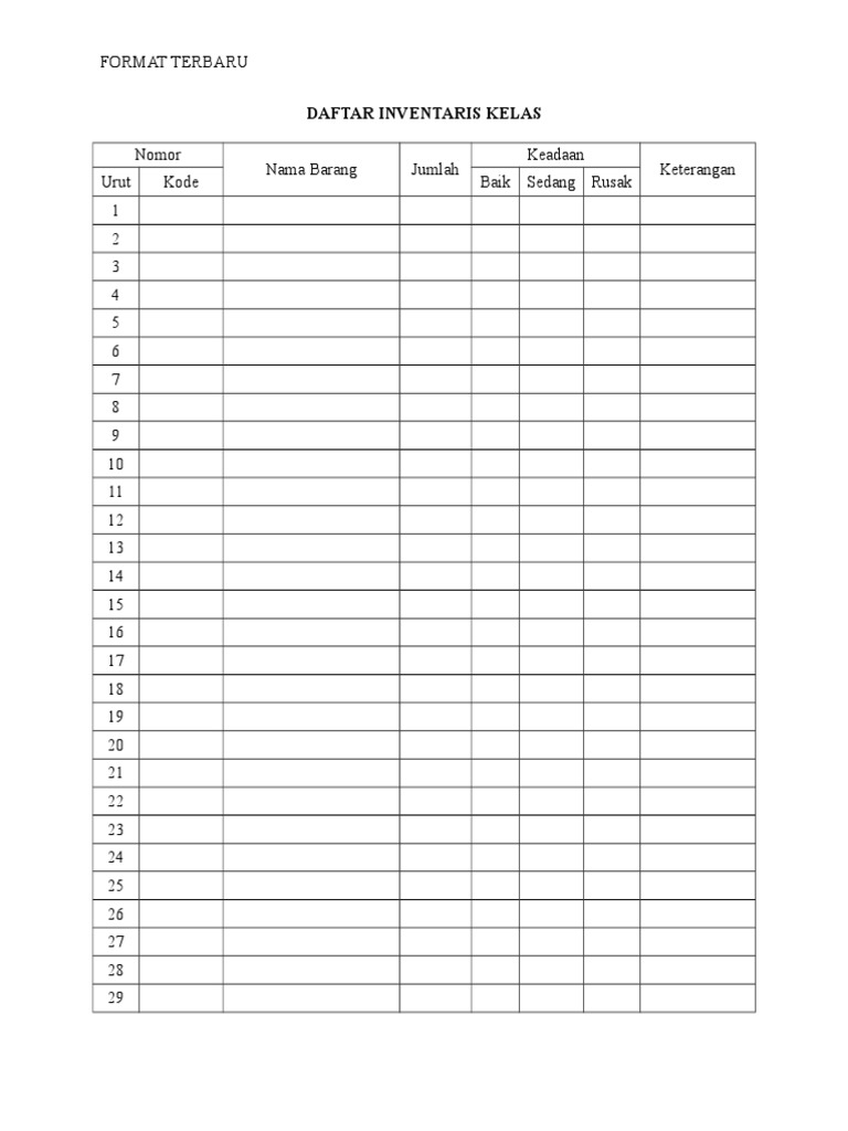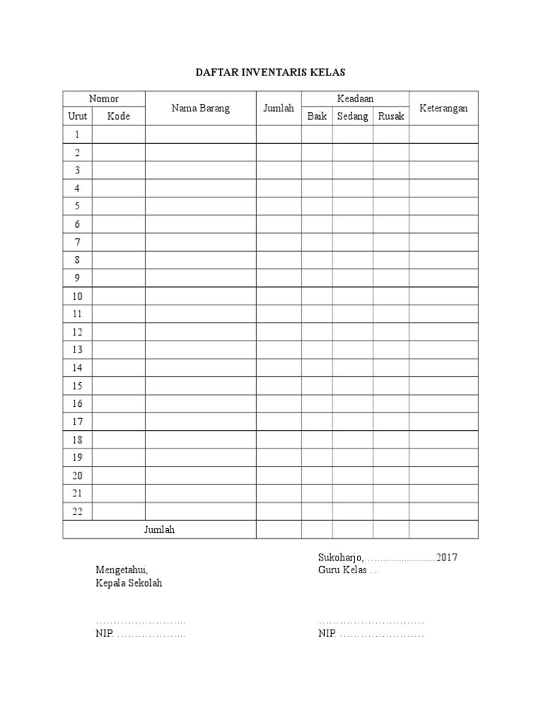 Format Inventaris Kelas. Format laporan inventaris barang format excel. Soal dan pembahasan tes masuk smp / mts tahun 2020/2021. Format daftar inventaris kelas untuk guru/ wali kelas ini merupakan format terbaru yang akan kami bagikan pada kesempatan kali ini khususnya untuk guru kelas atau wali kelas dalam menginventarisir barang/ medi/ alat pembelajaran dikelas. Daftar inventaris kelas no nama barang asal dari tahun keadaan jumlah keterangan b rr rb b: Download format laporan inventaris barang format excel ini dibagikan secara gratis untuk pengelola aset sekolah jenjang sd smp sma smk ma mts dan mi. Dokumen contoh format daftar barang inventaris sekolah tahun ajaran 2016 2017 dengan microsoft word doc belajar microsoft sekolah. Contoh format daftar inventaris kelas. Dengan kartu tersebut, kita sanggup mendata/ melaksanakan pendataan barang yang ada/dimiliki sekolah. Sign in to add files to this folder. Daftar inventaris barang sekolah dibuat secara berkala setidaknya setahun sekali dan perlu memperhatikan perkembangan barang termasuk juga pengurangannya. Format inventaris barang sekolah terbaru yang coba saya bagikan ini berbrntuk tabel dan di buat dengan menggunakan microsoft excel, anda dapat mengeditnya sesuai dengan kebutuhan. Sebagai bahan laporan tentang data inventaris barang yang dimiliki sekolah guru maupun ptk tata usaha akan membutuhkan format kartu. Download format doc dan aplikasi excel. Buku inventaris kelas artinya buku yang mencatat keadaan barang atau yang ada dalam lingkungan ruangan kelas di mana bapak dan ibu mengajar atau menjadi wali kelas. No files in this folder.