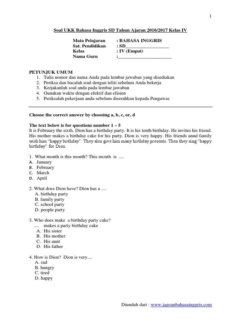 Soal Ukk Sd Bahasa Inggris Kelas 4.