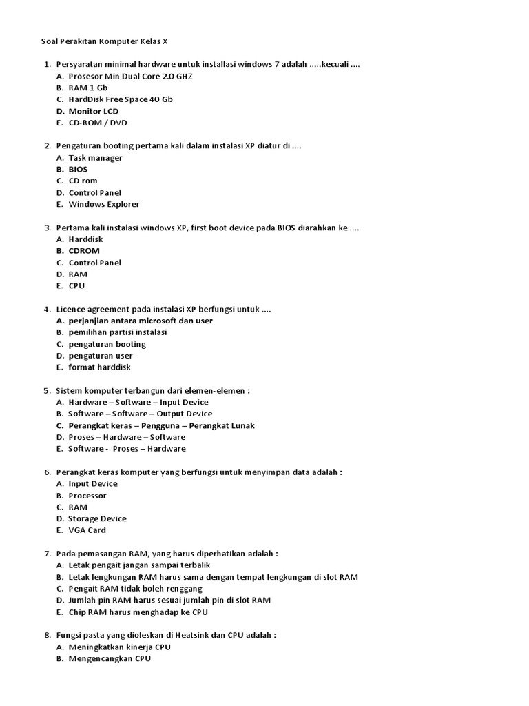 Lansung saja kami memberikan contoh soal tik kelas 10 untuk siswa sma/ma/smk/ sederajat, semester 1 dan 2. Berikut ini adalah rincian soal uas tik kelas 10 sma ma semester 1. Kumpulan soal uas pilihan ganda (ulangan akhir semester) perakitan komputer semester 1 tahun 2016/ 2017 untuk tkj dan rpl 1. Maka bisa dipastikan keseluruhannya hampir mirip dengan yang akan diujikan tahun ini. Soal dan jawaban pilihan ganda mapel perakitan komputer kelas 10 1. Soal latihan penjaskes kelas 10 disertai kunci jawaban untuk ukk pat semester 2 ini kami dedikasikan kepada para siswa sma ma dan smk mak kelas 10 yang akan mengikuti ulangan kenaikan kelas ukk atau penilaian akhir tahun pat semester 2. A) ram b) power supply c) cpu d) motherboard e) alu Biaya pendidikan ui ( universitas indonesia ) tahun ajaran 2021/2021. Download kunci jawaban dan soal soal uas qur 39 an hadits kelas.