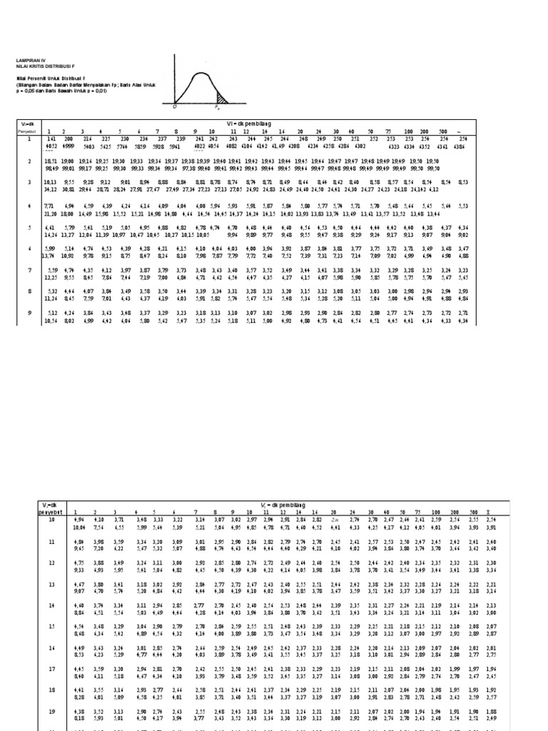 Ketik rumus ini =finv (0.05,3,8). Perlu diperhatikan bahwa tabel distribusi f yang digunakan merupakan tabel dengan tingkat signifikansi 0,05. Ini juga terletak pada statistik uji yang mau dipakai. Tabel t lengkap 1 300 pdf. Download as pdf, txt or read online from scribd. Nilai persentil untuk distribusi f f p: | tabel f titik persentase distribusi f untuk probabilita = 0,05 df untuk penyebut (n2) df untuk pembilang (n1) 1 2 3 4 5 6 7 8 9 10 11 12. Baris atas untuk p=0,05 baris bawah untuk p= 0,01 2= dk penyebut 1: Hasil yang diperoleh dari nilai hitung akan dibandingkan dengan nilai tabel statistik, sehingga dapat diketahui seperti apakah keputusan yang akan diambil dalam analisis.