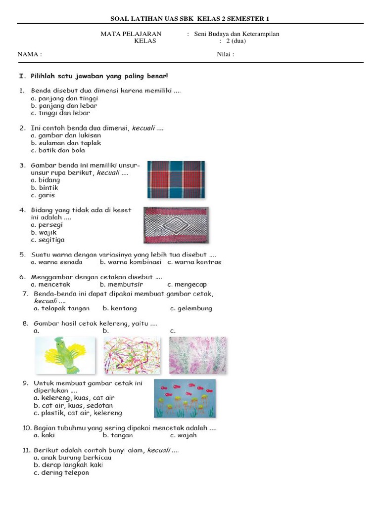 Soal uas sbk sd kelas 3 semester 1. Motif isen yang berbentuk garis pendek disebut…. Kelompok pertama terdiri dari muatan ppkn dan bahasa indonesia dan kelompok kedua terdiri dari muatan. Dibawah ini adalah soal uas mata pelajaran sbk untuk kelas 3 sd semester 1 atau ganjil dan disertai dengan kunci jawaban sebagai bahan pembelajaran dalam menghadapi ulangan akhir semester ganjil. Merekapun tidak peduli akan hasil yang dicapai pada uas/pas yang di bawah kkm. Berilah tanda silang (x) pada jawaban yang benar! Menurut fungsi atau tujuan penciptaannya seni rupa terbagi menjadi dua, yaitu…. Silahkan dipelajari soal uas sbk kelas 4 semester 1 ini. Telah kami sampaikan diawal artikel bahwa, akan kami bagikan soal penilaian akhir semester kelas 3 tersebut dengan gratis dan mudah untuk semester 1 lengkap. Berikut, contoh soal sbk kelas 10 semester 1 kurikulum 2013 dengan kunci jawabannya.
