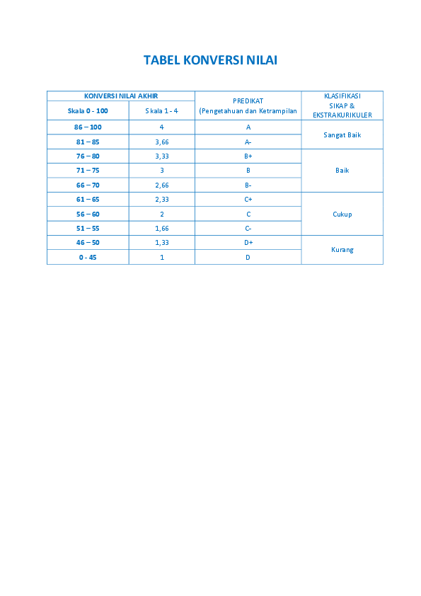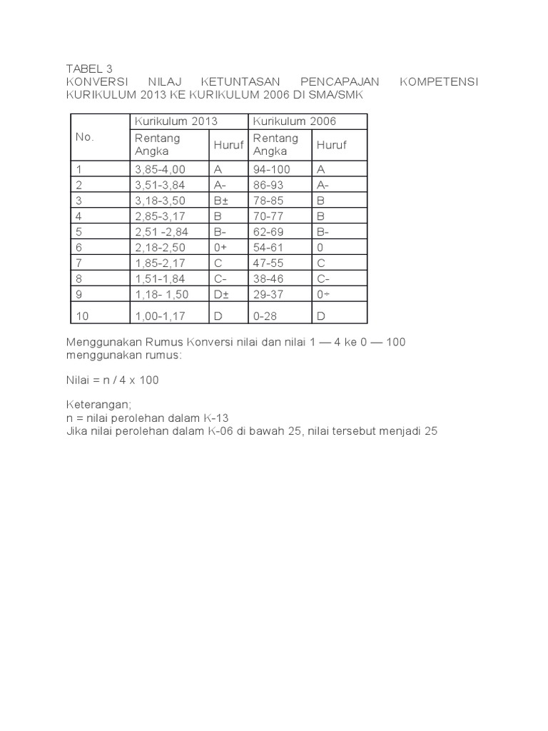 Tabel Konversi Nilai K13. A = nilai asli terendah. Deskripsi = sudah baik dalam mengerjakan praktik dan proyek, namun masih perlu ditingkatkan kedisiplinan merapikan tugas dalam satu portofolio. 20) x 20% = 8. Pencapaian minimal untuk kompetensi sikap adalah b. Inpassing jabatan fungsional gbpns dan angka kreditnya ditetapkan berdasarkan dua hal, yaitu kualifikasi akademik dan masa kerja. Konversi nilai 1 4 ke 1 100. Rentang nilai untuk kurikulum 2013 berikut ini adalah rentang nilai untuk kurikulum 2013 yang bisa anda download secara gratis di website kami. Tabel contoh interval nilai dan predikatnya untuk kkm 75. File ini kami bagikan secara gratis di unduh hanya di excel berkas sekolah. Pertama, siapkan data yang akan di konversi.dalam contoh ini data nilai yang akan dikonversi menjadi huruf ada pada kolom c.sedangkan hasil konversi akan diletakkan pada kolom d. Konversi nilai 1 4 ke 1 100. Panduan penilaian untuk sekolah dasar sd halaman 9 dalam menetapkan kkm satuan pendidikan harus merumuskannya secara bersama sama kepala sekolah pendidik dan tenaga. Lalu siapkan tabel daftar nilai yang kosong sesuai dengan kebutuhan. Panjang interval nilai untuk mata pelajaran matematika bisa ditentukan menggunakan cara sebagai berikut : Penilaian dan model rapor (flora vargas)